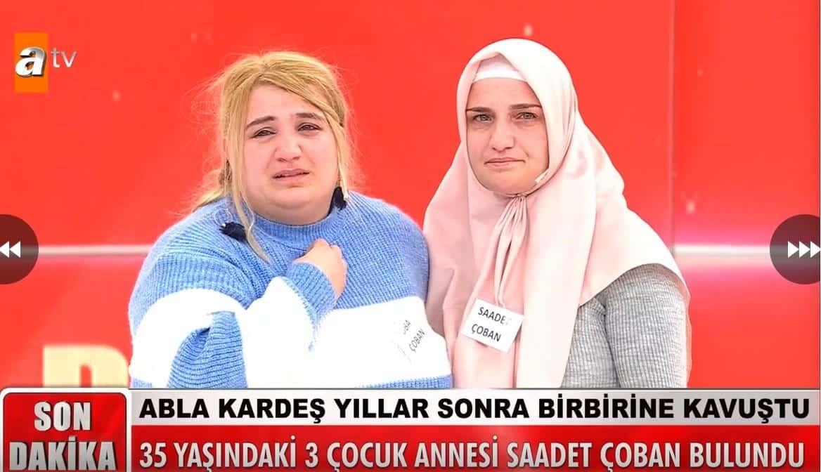 Saadet Çoban’ın ablası; kardeşinin bulunması için Müge Anlı’nın sunduğu Tatlı Sert programına katıldı. Buradan sesini duyuran Tuba Çoban bir ay sonra kardeşine kavuştu. Canlı yayın programında ablasına kavuşan genç kadın gözyaşlarına hakim olamadı.