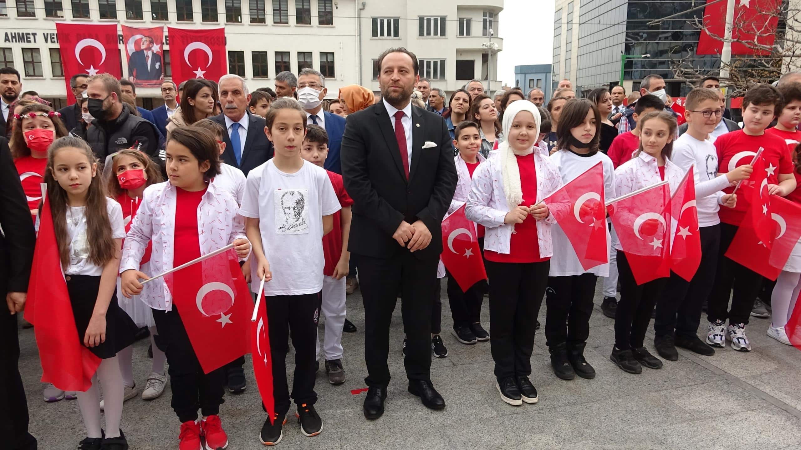 Heykel Meydanı’ndaki Atatürk Anıtı önündeki törende, saygı duruşu ve İstiklal Marşı’nın okunmasının ardından, İl Milli Eğitim Müdürü Serkan Gür, çelenk sundu. Bir çok okuldan ellerinde Türk bayraklarıyla törene katılan öğrenciler, renkli görüntüler oluşturdu. Hep bir ağızdan şarkılar söyleyen çocuklar, herkesin yüzünü gülümsetti.