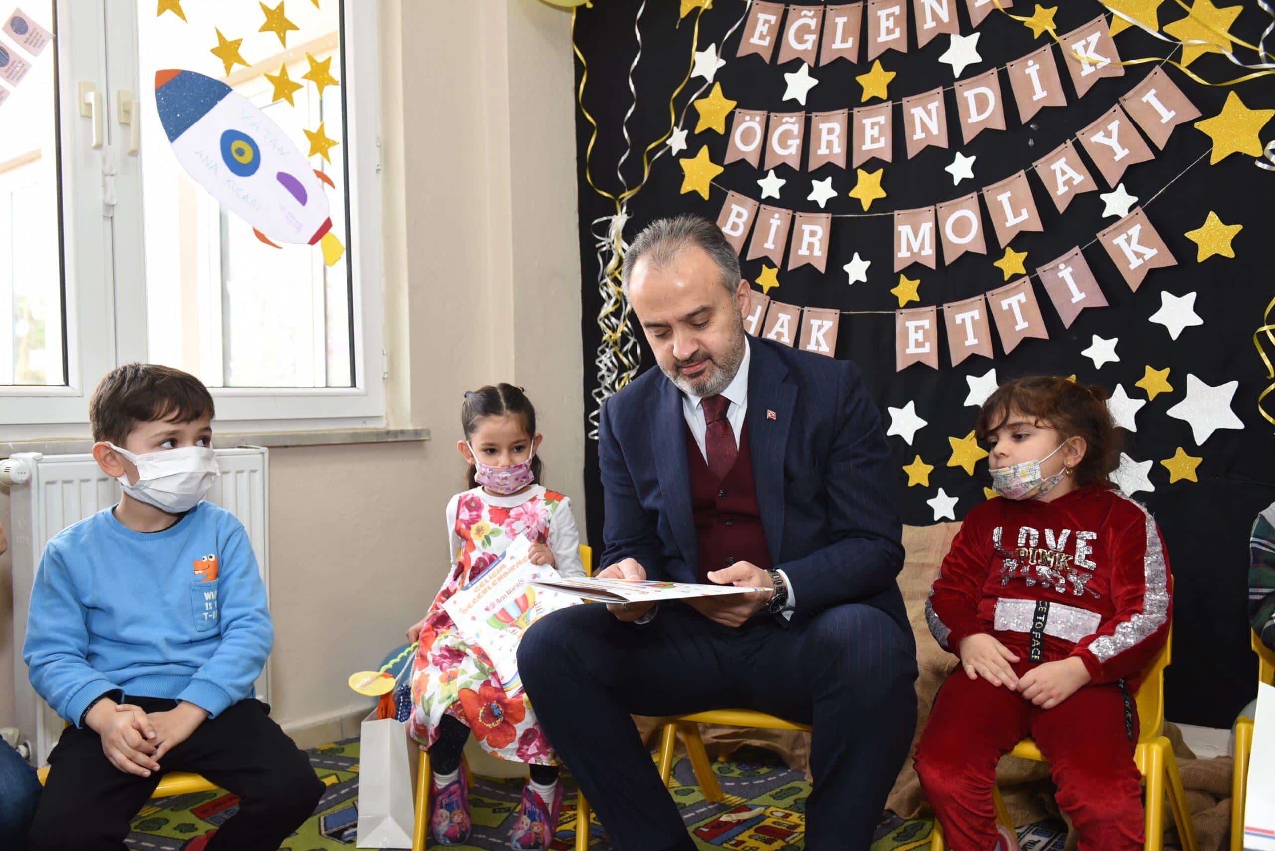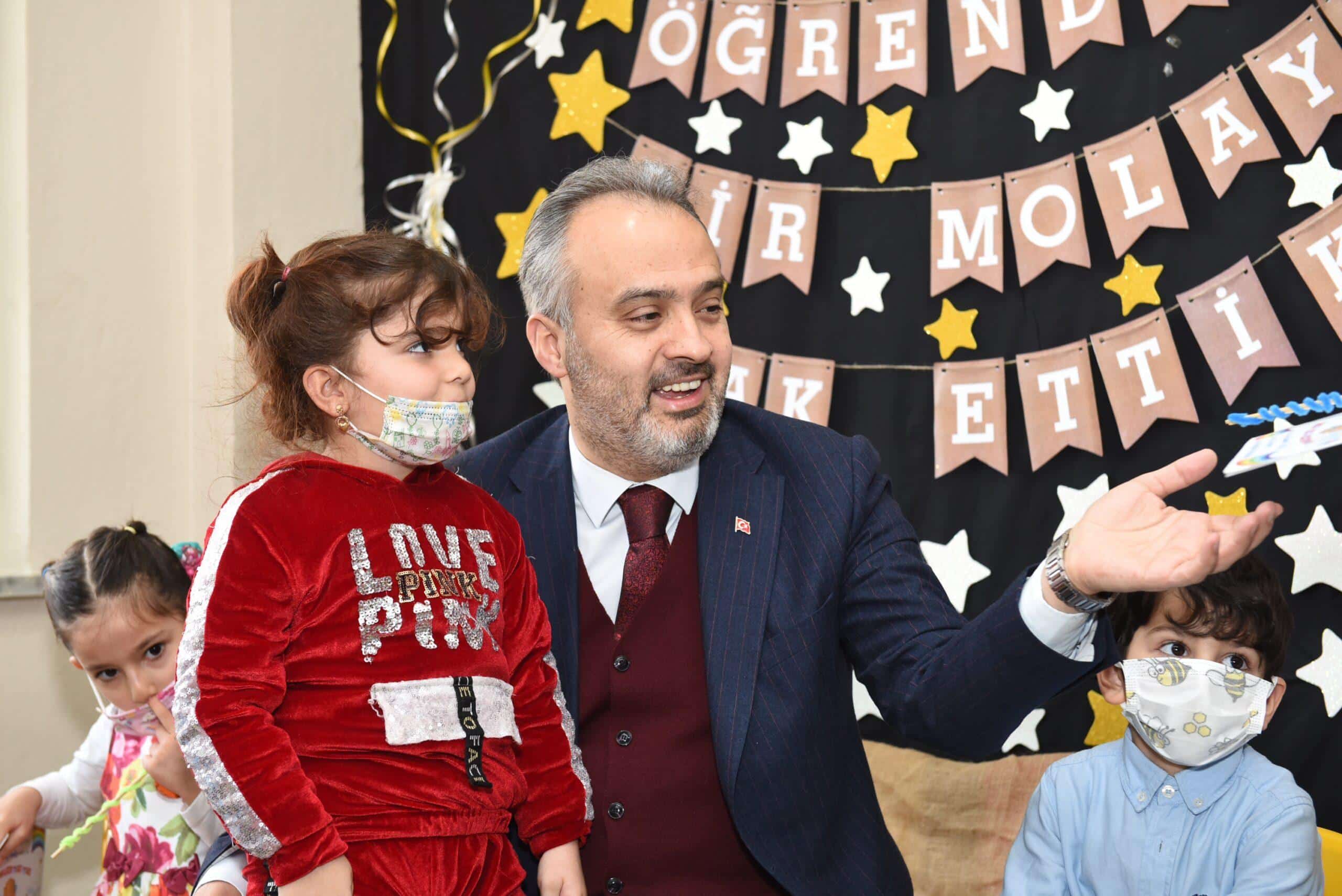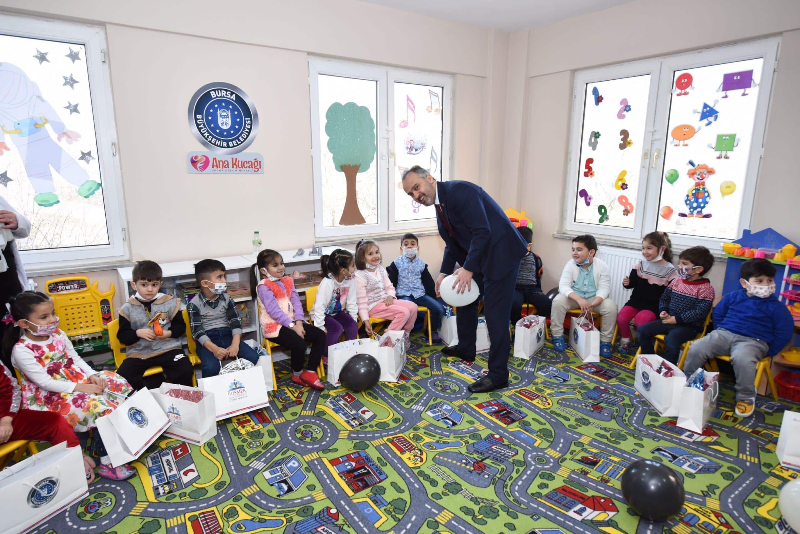 Büyükşehir Belediye Başkanı Alinur Aktaş, Vatan Ana Kucağı Eğitim Merkezi’ni ziyaret edip, miniklerin karne sevincine ortak oldu. Çocuklarla sohbet edip, onlara çeşitli hediyeler veren Başkan Aktaş, Ana Kucağı projesini çok önemsediklerinin altını çizdi. Okul öncesi eğitim alan çocukların eğitim hayatlarında çok daha başarılı olduklarının gözlendiğini dile getiren Başkan Aktaş, “Öncelikle çocuklarımızın hepsini gözlerinden öpüyorum. Onlara mutlu bir tatil ve güzel ömür diliyorum. Bugün itibariyle, 17 merkezde 119 öğretmenimiz ve 1300’e yakın öğrencimiz yarıyıl tatiline çıkıyor. Burada çocuklarla anneleri ve ablaları gibi ilgilenen bir eğitim kadromuz var. Milli Eğitim müfredatının yanında Şehrim Bursa ve değerler eğitimi de veriyoruz. Çocuklarımızın ‘şehrin değerlerini bilen, anne ve babalarına saygılı, devletini, milletini seven, milli ve manevi değerlere bağlı bireyler olarak’ yetişmesi için elimizden geleni yapıyoruz. Bugün onların karne heyecanına ortak olmak beni de ziyadesiyle mutlu etti” dedi.