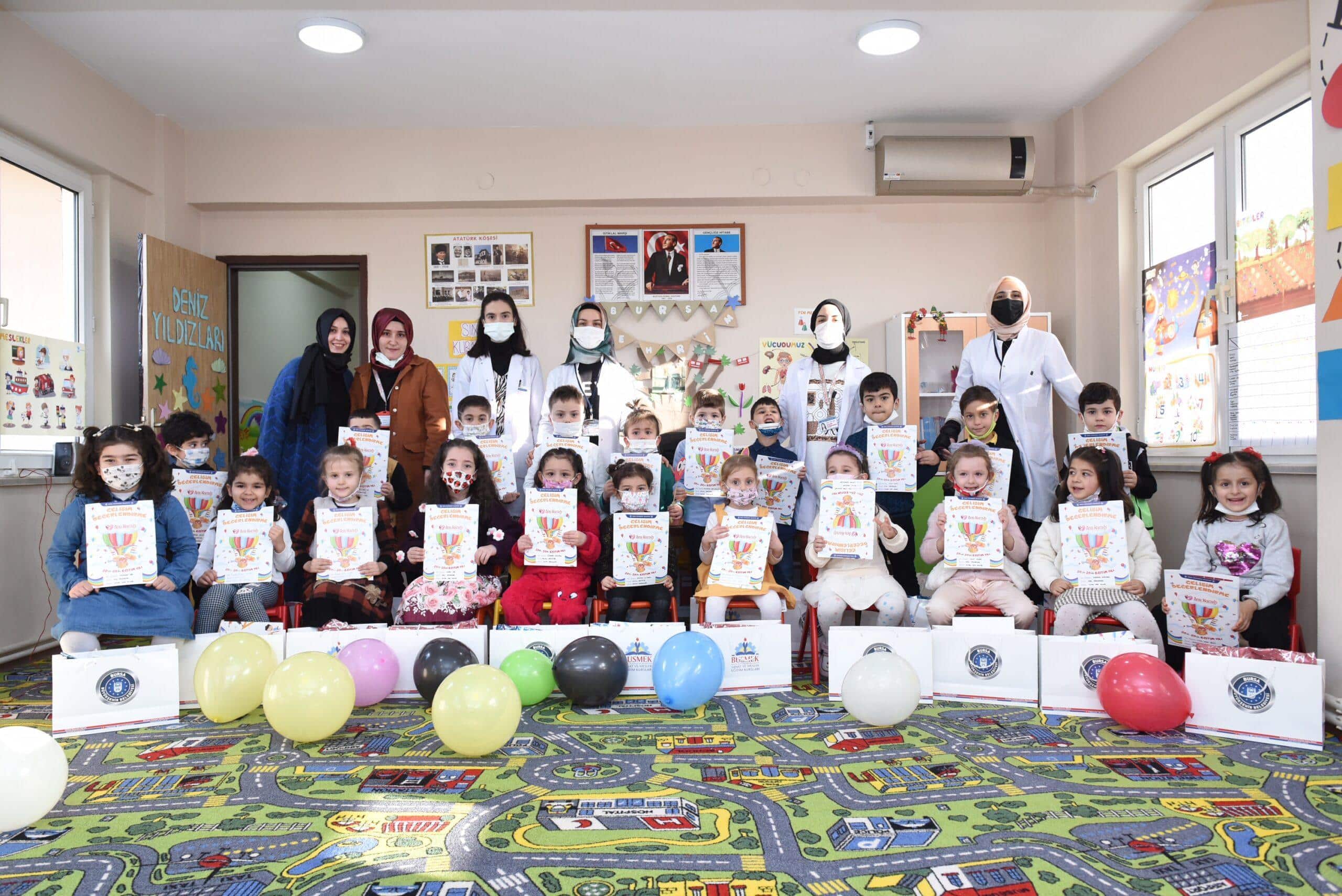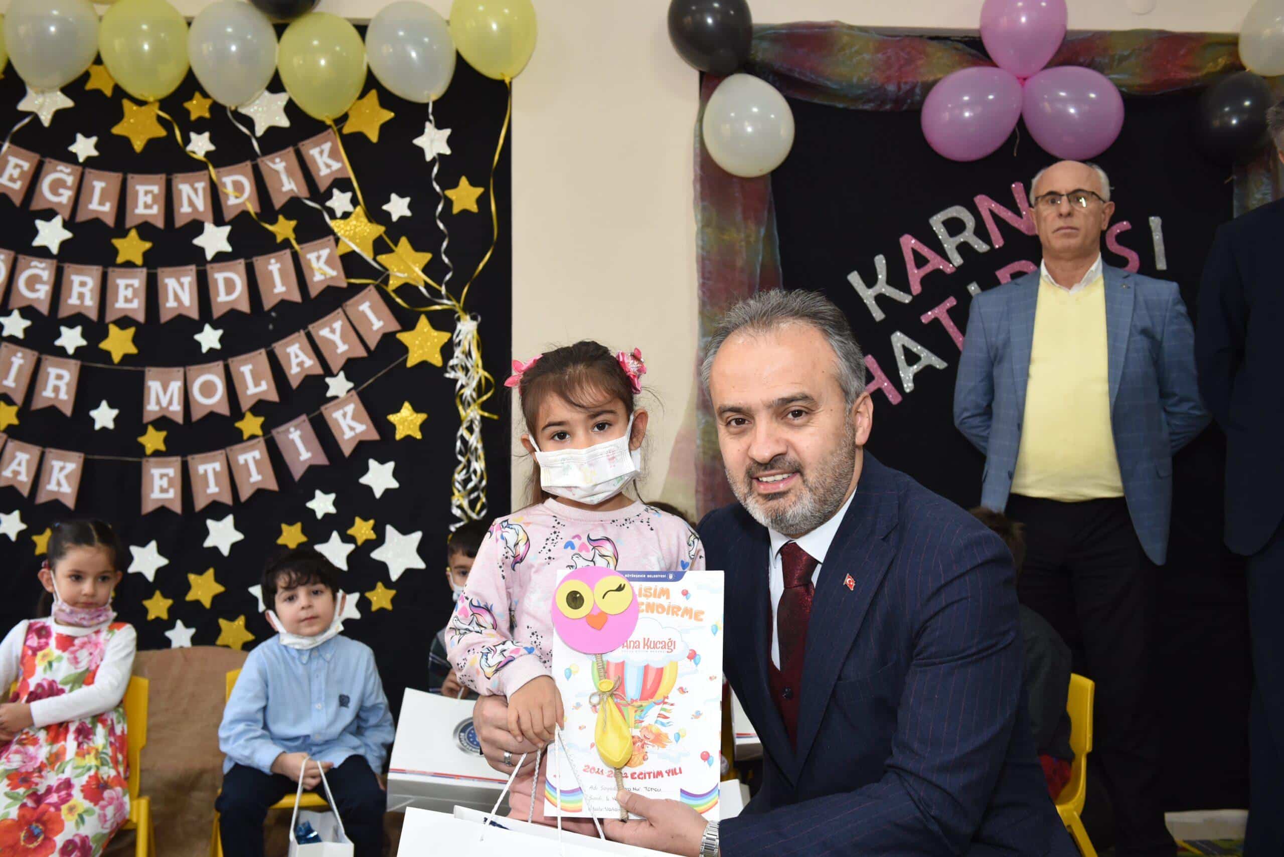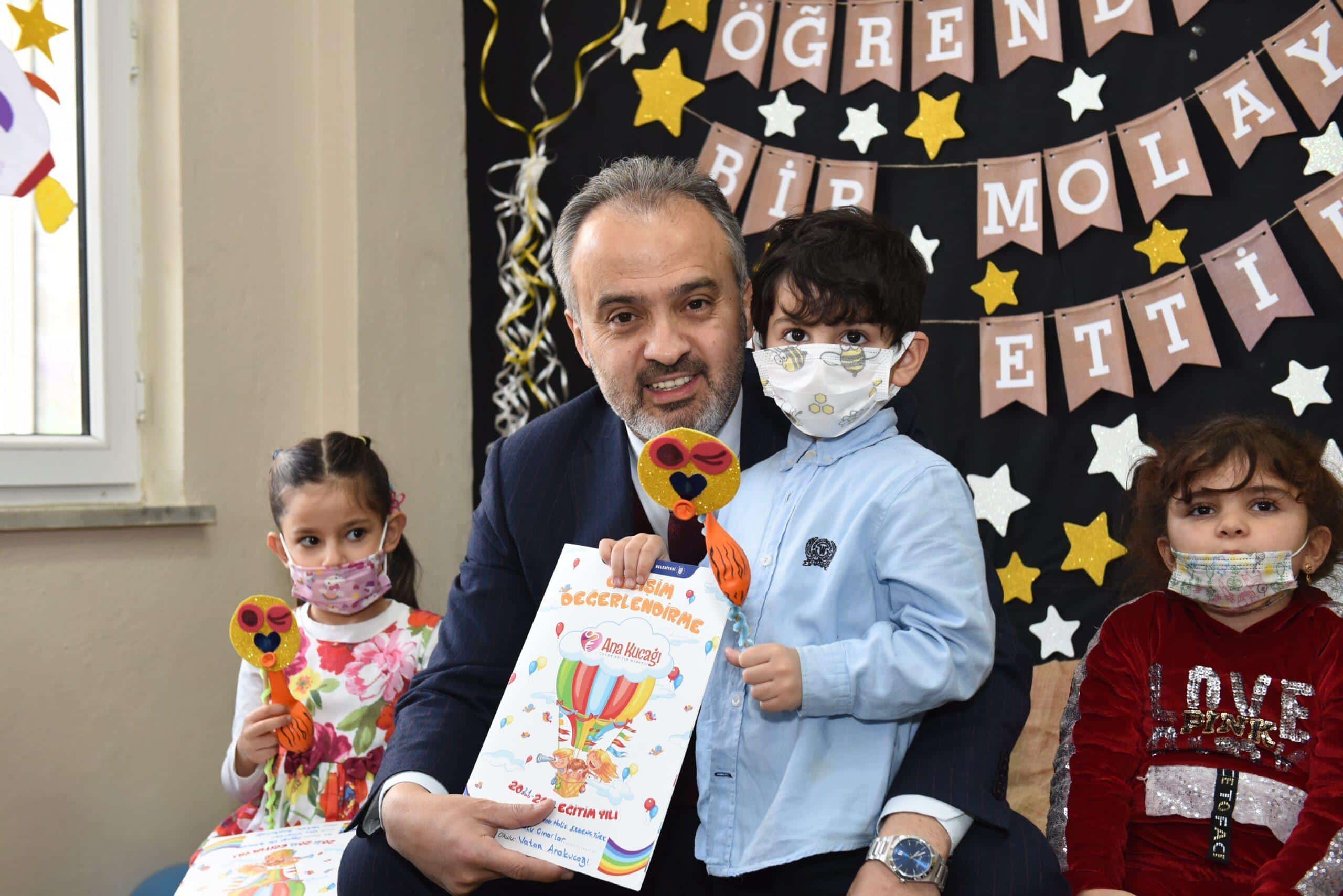 Bursa Büyükşehir Belediyesi’nin toplumun her kesiminin okul öncesi eğitim hizmetlerinden faydalanabilmesi maksadıyla kurduğu Ana Kucağı eğitim merkezlerinde 1300’e yakın çocuk karne sevinci yaşadı. Vatan Ana Kucağı Eğitim Merkezi’ndeki karne sevincine ortak olan Büyükşehir Belediye Başkanı Alinur Aktaş, karnelerini verdiği çocuklara iyi bir tatil geçirmelerini diledi.