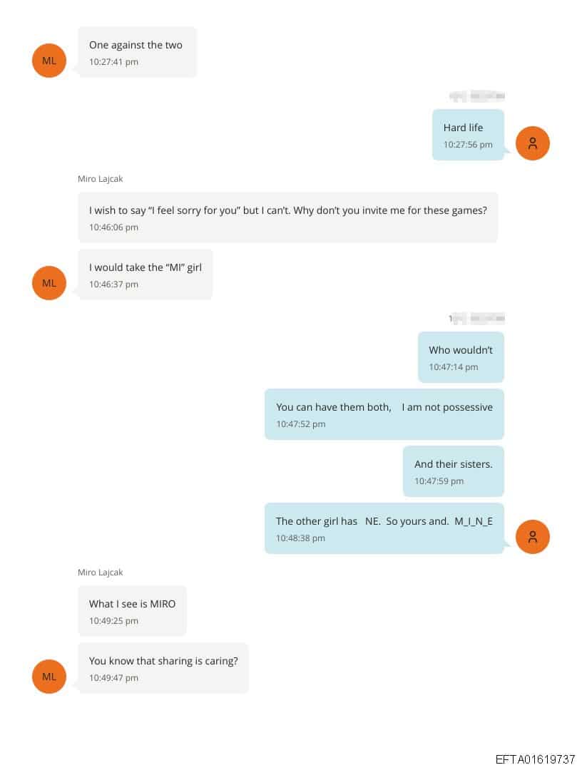 ABD Adalet Bakanlığı’ndan yayınlanan yaklaşık 3 milyon sayfalık belgelerde Ekim 2018 tarihinde Lajcak ve Eptstein arasında kadınlar ve Slovak diplomatın Rusya Dışişleri Bakanı Sergey Lavrov ile yakın zamanda gerçekleştireceği görüşmeye ilişkin yazışmalar yer aldı. Epstein’in Lajcak’a gönderdiği belgelerde belirtilmeyen fotoğraflı mesajın ardından Slovak siyasetçinin, “Neden beni bu tür oyunlara davet etmiyorsun” diye sorduğu kaydedildi.