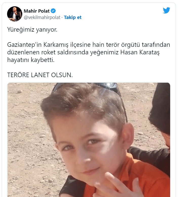 Karkamış’ta hafta boyunca okullar tatil edildi. Saldırıda yaşamını yitiren çocuğun, CHP Milletvekili Mahir Polat’ın yeğeni olduğu öğrenildi. TSK da saldırı sonrası terör hedeflerini vuruyor.