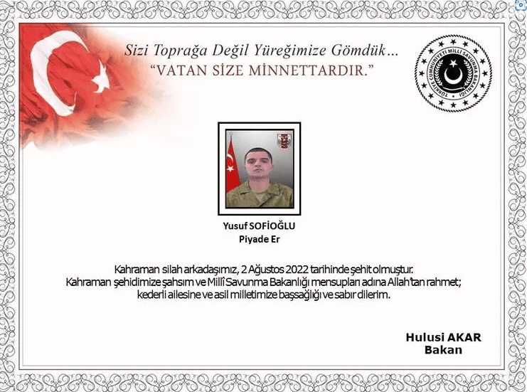“Altınözü Hatay hududunda 29 Temmuz 2022 tarihinde araç kazası sonucu yaralanarak hastaneye sevk edilen kahraman silah arkadaşımız Piyade Er Yusuf Sofioğlu, yapılan tüm müdahalelere rağmen kurtarılamayarak 2 Ağustos 2022 tarihinde şehit olmuştur. Bizleri derin bir acı ve üzüntüye boğan bu olayda hayatını kaybeden aziz şehidimize Allah’tan rahmet, kederli ailesine, Türk Silahlı Kuvvetleri (TSK) ile asil milletimize başsağlığı ve sabır dileriz.”