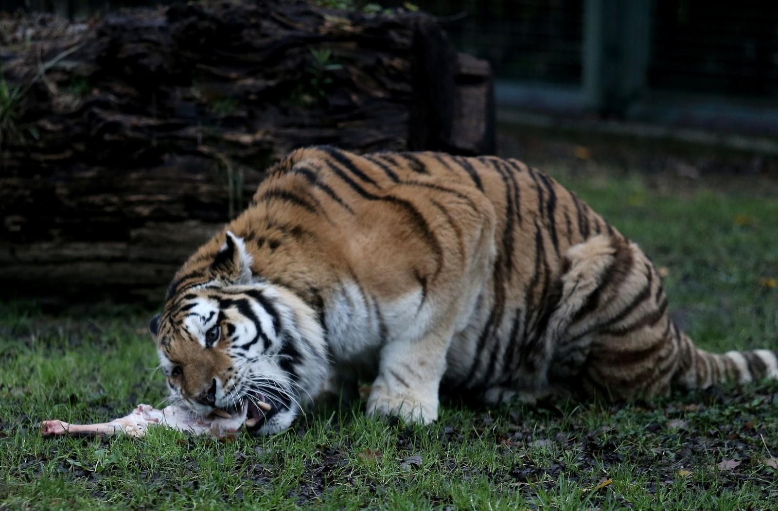 Direğin üzerine bakıcısı tarafından asılan etin kokusunu alan amur kaplanı, gözüne kestirdiği eti tek hamlede kaptı. Afiyetle etini yiyen kaplan, bu egzersizlerle ormanda yaşamış gibi zinde ve çevik kalıyor.