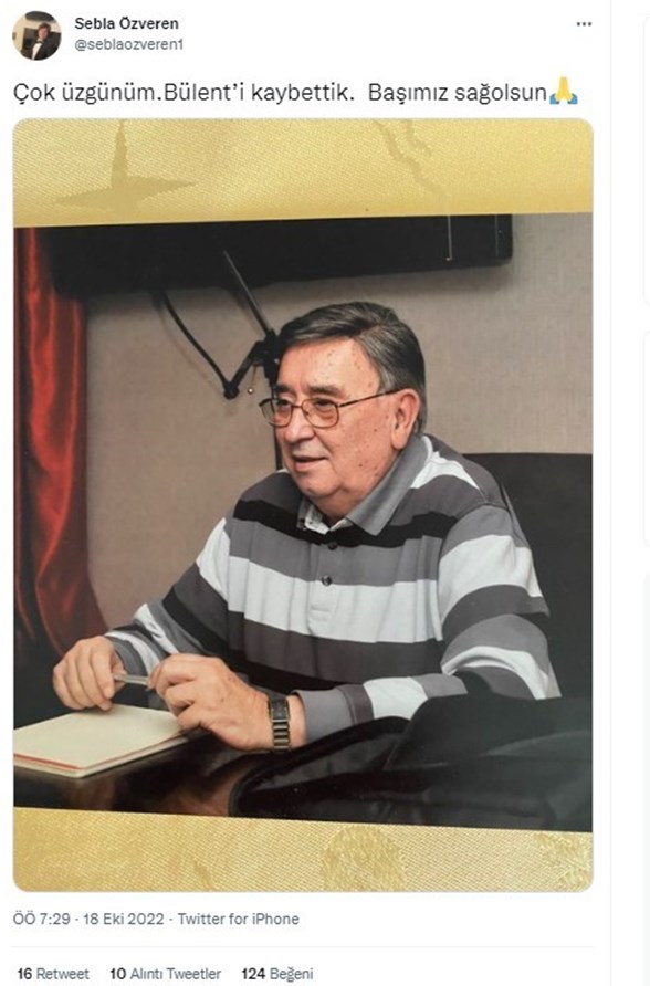 Özveren “Çok üzgünüm. Bülent’i kaybettik. Başımız sağolsun” notuyla sunucu Bülent Özveren’in yaşamını yitirdiğini duyurdu.